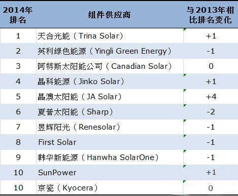天合光能 (Trina Solar) 預(yù)計將成為 2014 年全球出貨量最大的光伏組件供應(yīng)商。晶澳太陽能 (JA Solar) 將成為全球十大光伏組件供應(yīng)商中排名上升幅度最大和出貨量增長速度最快的供應(yīng)商。SunPower 將成功躋身 2014 年全球十大光伏組件供應(yīng)商行列,和京瓷 (Kyocera) 并列第十位。