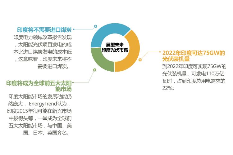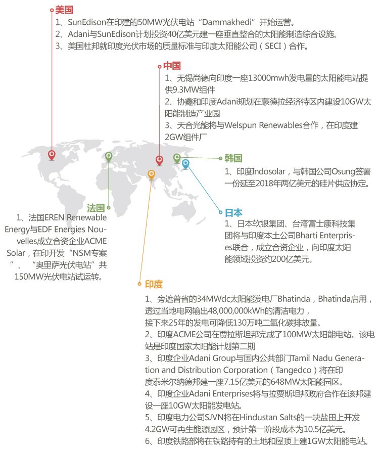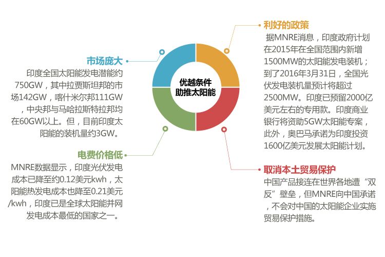 印度成為2015年受全球矚目的光伏投資熱土,離不開它自身豐富的太陽能條件,加上印度政府不斷推出光伏支持政策,如制度光伏目標(biāo)及年度實(shí)施計(jì)劃等,進(jìn)一步推動印度光伏市場朝較熱的趨勢發(fā)展。